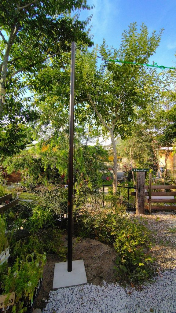 次に、この穴にセメントを流し込み、強固な基礎を作ってポールをまっすぐに立てます。こうすることで、ある程度の風が吹いても倒れる心配がなく、安心してシェードを張ることができます。