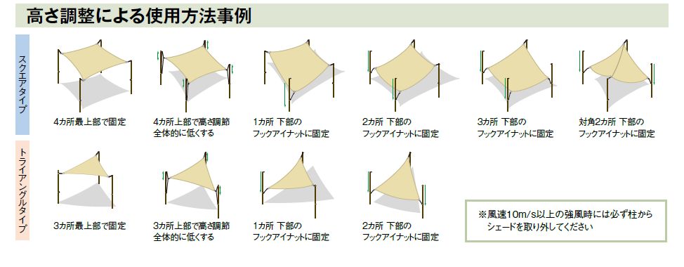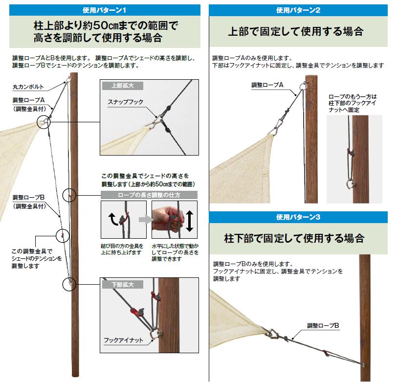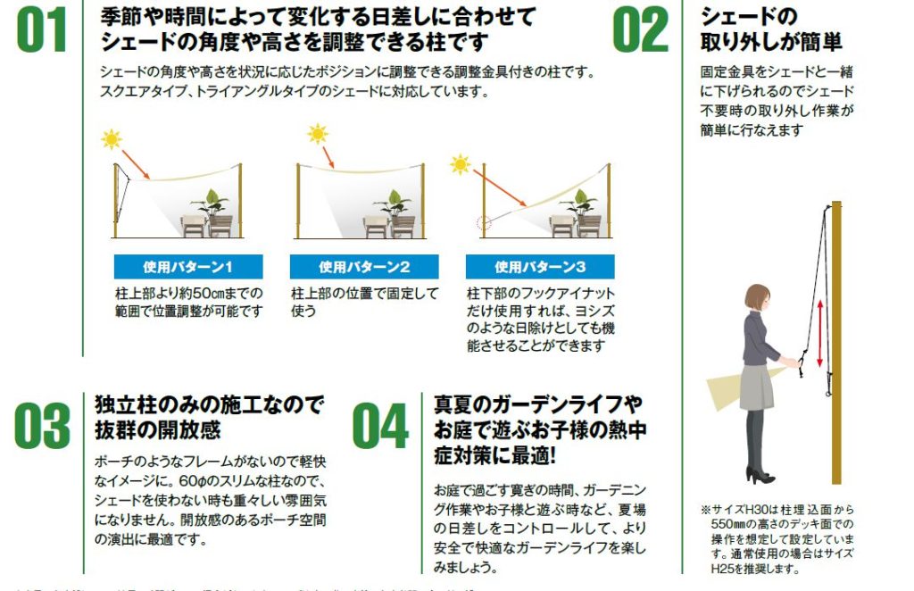 この調整機能付きポールは、取り外しが簡単なのも大きなメリットです。季節や天候に合わせて、手軽にシェードを付け外しできます。
